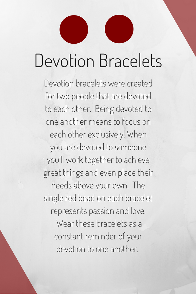 Bracelet meaning: Devotion bracelets were created for two people that are devoted to each other. Being devoted to one another means to focus on each other exclusively. When you are devoted to someone you'll work together to achieve great things and even place their needs above your own. The single red bead on each bracelet represents passion and love. Wear these bracelets as a constant reminder of your devotion to one another.