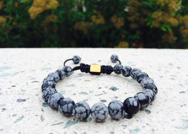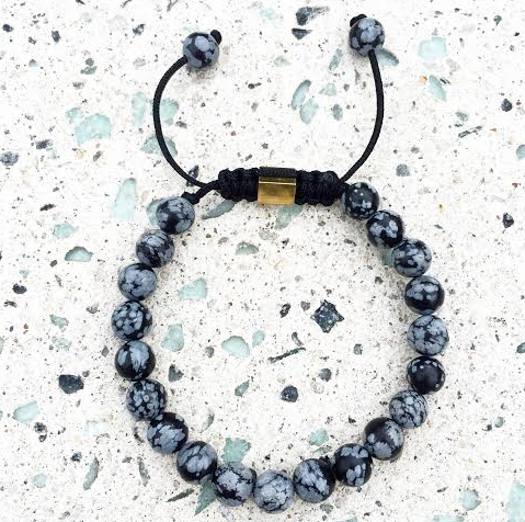 Grey & Black October Bracelet features marbled grey & black beads, with a Gold block that adjusts to whatever size you wrist is.