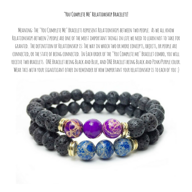 - Bracelets Meaning: The "You Complete Me" Bracelets represent Relationships between two people. As we all know Relationships between 2 people are one of the most important things in life we need to learn not to take for granted. The definition of Relationship is: The way in which two or more concepts, objects, or people are connected, or the state of being connected. In Each order of the "You Complete me" Bracelet combo, you will receive two bracelets. ONE Bracelet being Black and Blue, and ONE Bracelet being Black and Pink/Purple color. Wear this with your significant other in reminder of how important your relationship is to each of you :)