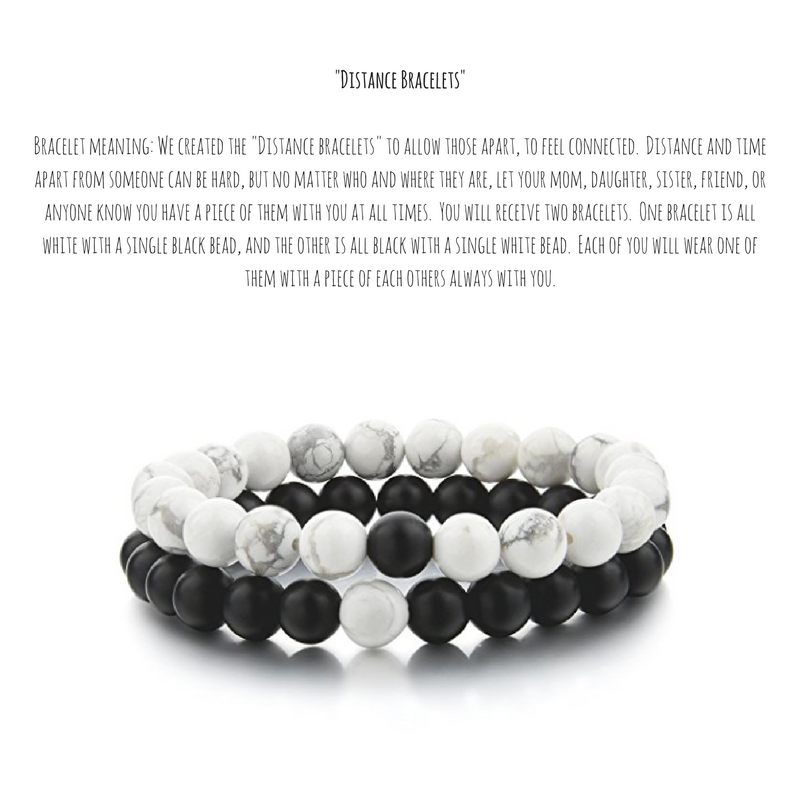 - Bracelet meaning: We created the "Distance bracelets" to allow those apart, to feel connected. Distance and time apart from someone can be hard, but no matter who and where they are, let your mom, daughter, sister, friend, or anyone know you have a piece of them with you at all times. You will receive two bracelets. One bracelet is all white with a single black bead, and the other is all black with a single white bead. Each of you will wear one of them with a piece of each others always with you.