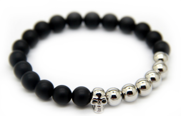 This piece features 8mm Matte Black Beads, with Silver accent Beads. The piece is finished by a Stunning Silver Skull that is truly hard to miss. This piece will turn heads!