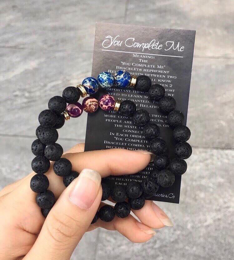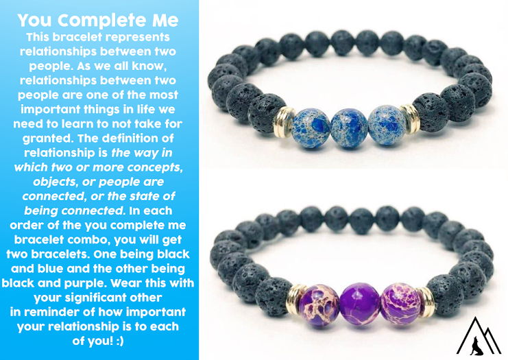 Meaning: The "You Complete Me" Bracelets represent Relationships between two people. As we all know Relationships between 2 people are one of the most important things in life we need to learn not to take for granted. The definition of Relationship is: The way in which two or more concepts, objects, or people are connected, or the state of being connected. In Each order of the "You Complete me" Bracelet combo, you will receive two bracelets. ONE Bracelet being Black and Blue, and ONE Bracelet being Black and Pink/Purple color. Wear this with your significant other in reminder of how important your relationship is to each of you :)