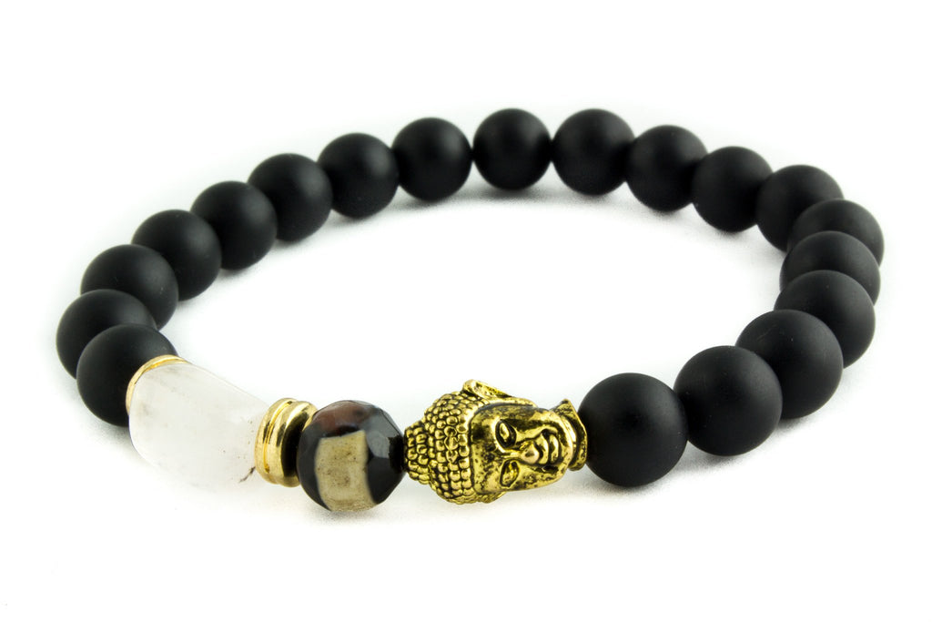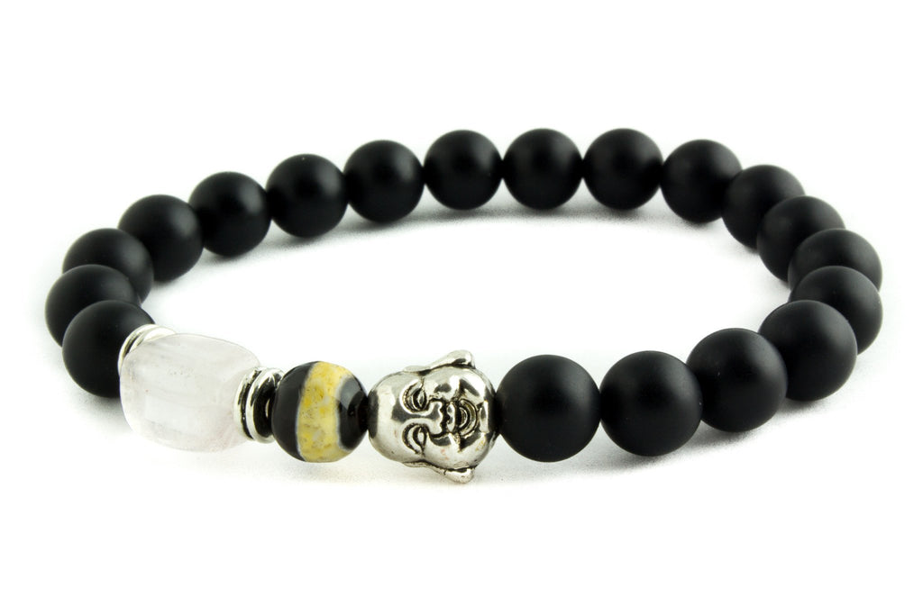 2: Matte Black Agate Beads & Gold Buddha Bracelets with Pink Crystal